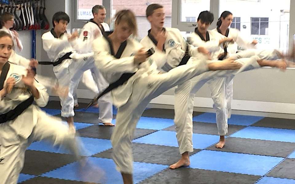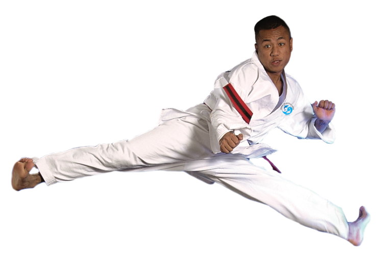 Martial artist blocking and punching at the same time.